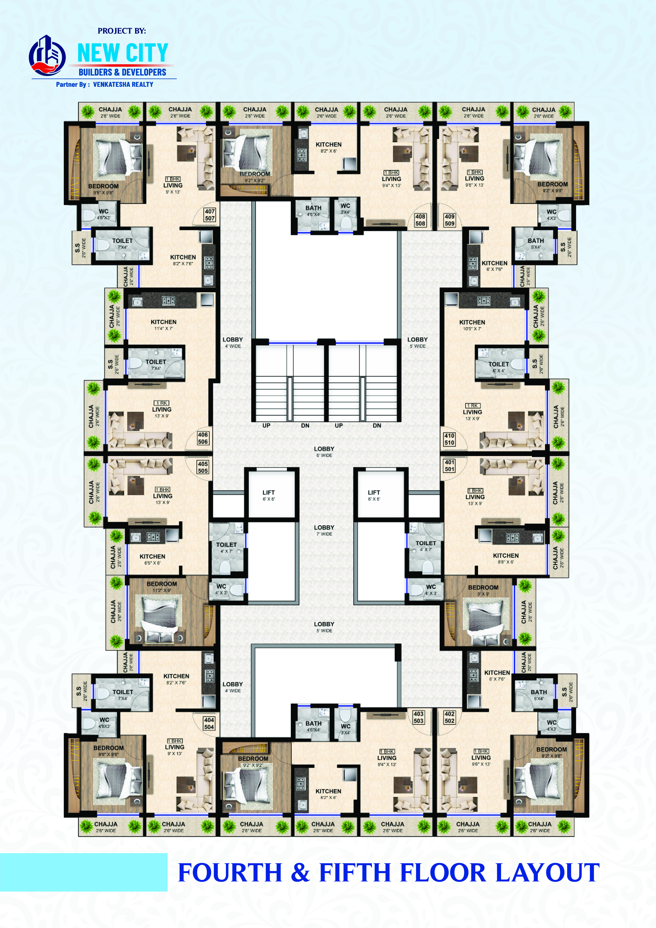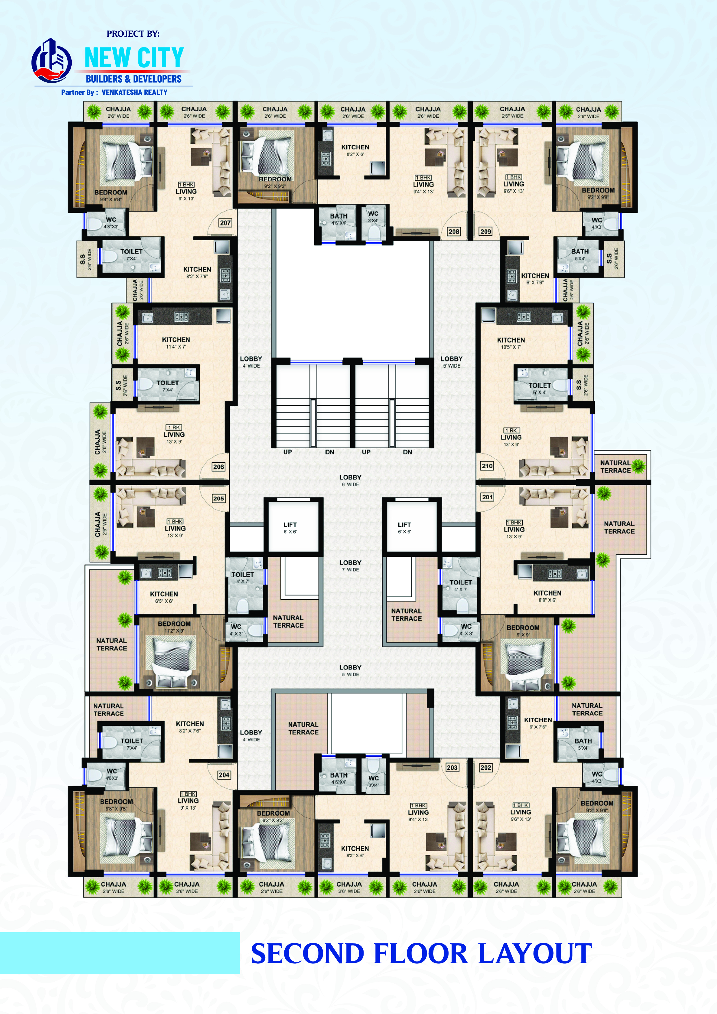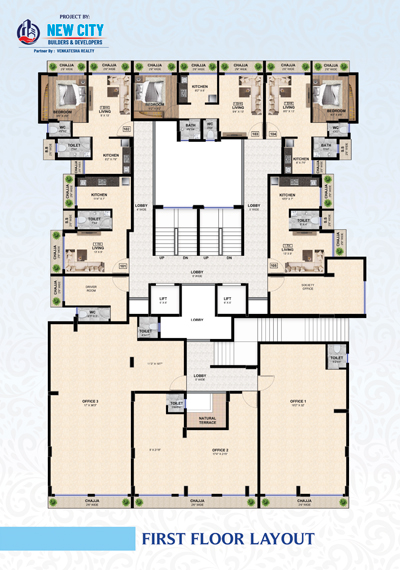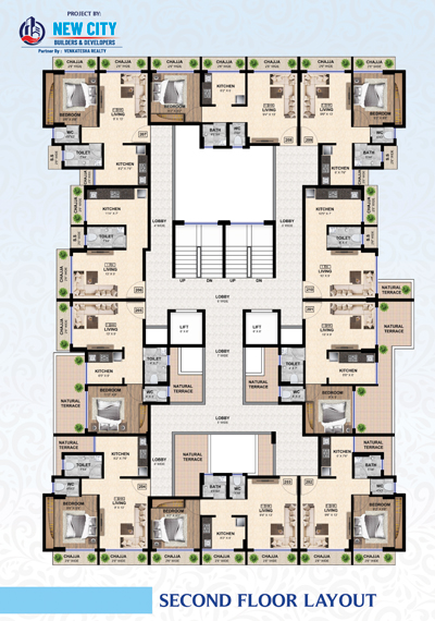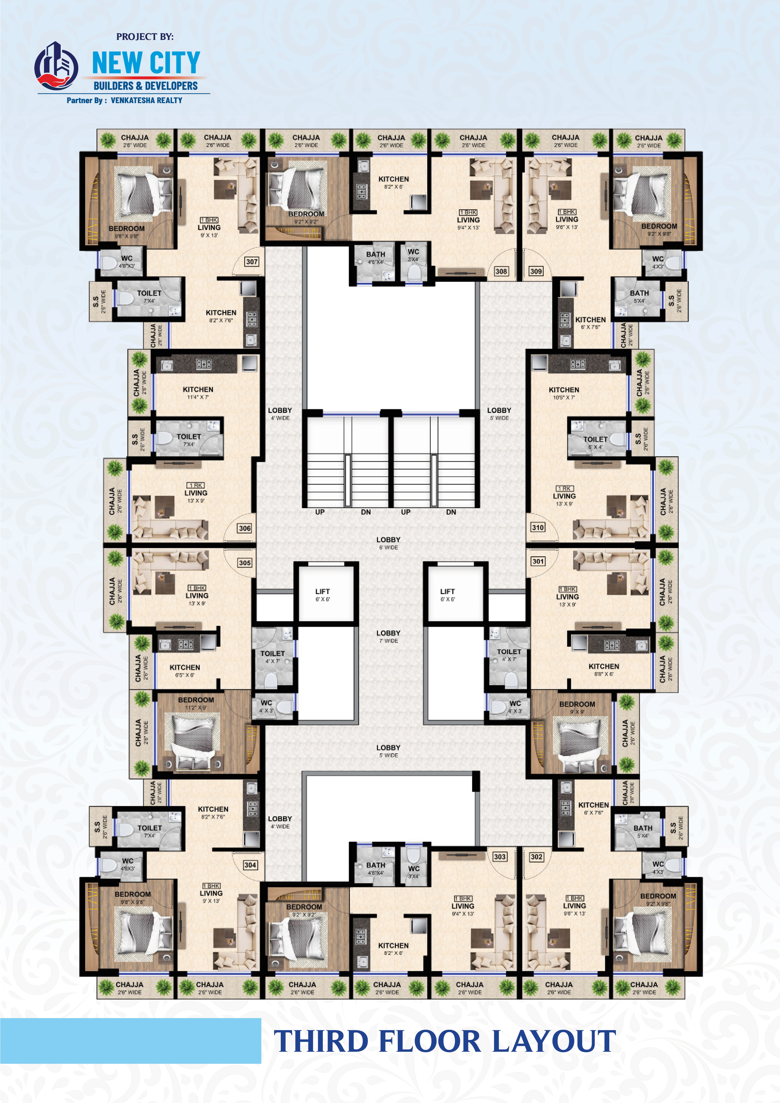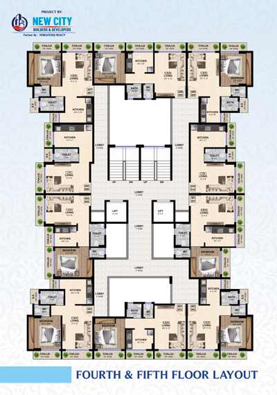 Designer glazed tiles dado upto beam bottom. Branded sanitary wares. Concealed plumbing with premium quality C. P. fitting.