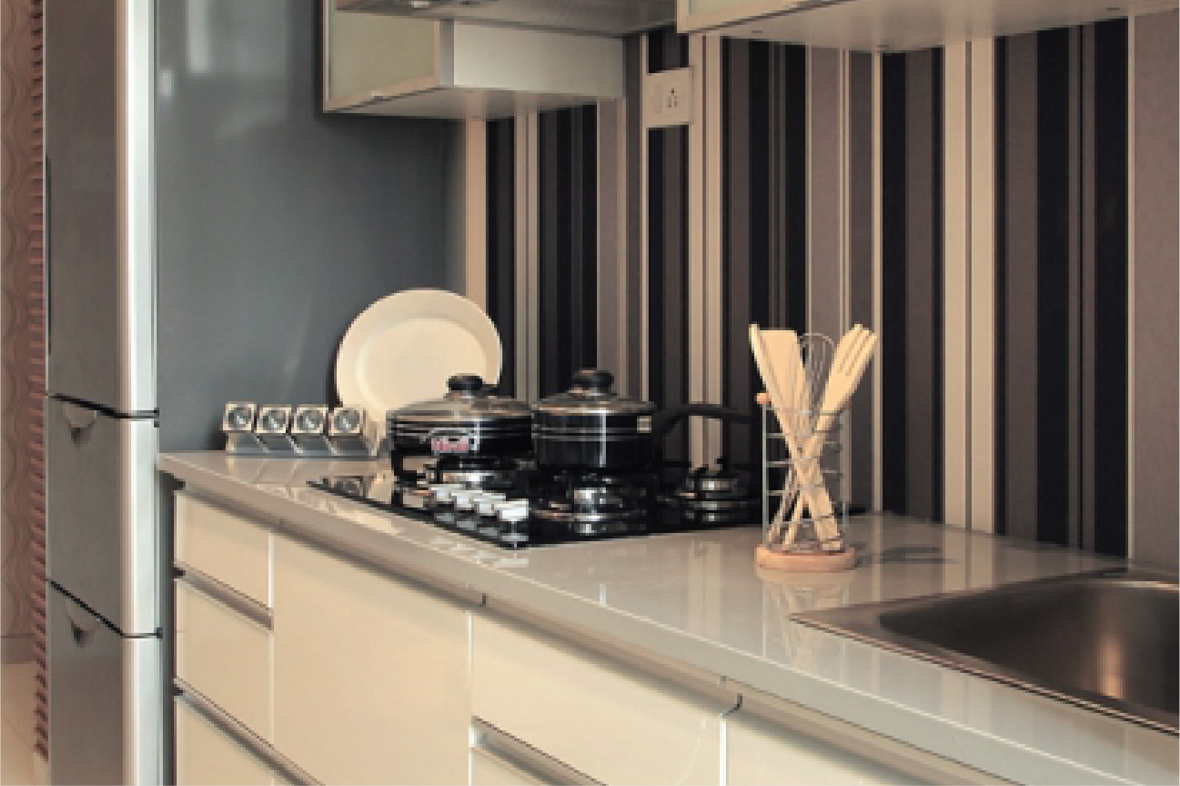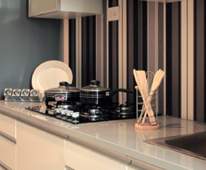Granite kitchen platform with S. S. Sink. Wall tiles dado up to beam level.