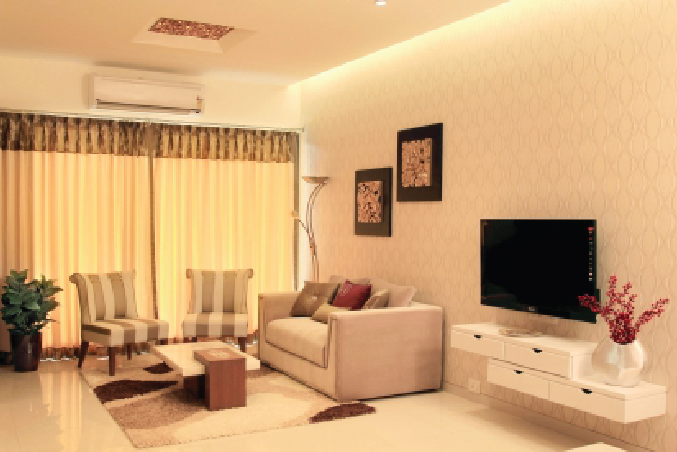 Concealed brand copper wiring & fittings. Provision of cable tv in living & bedrooms. AC point provision in bedrooms.