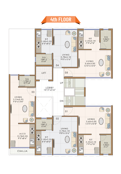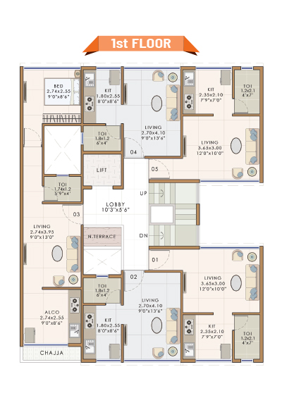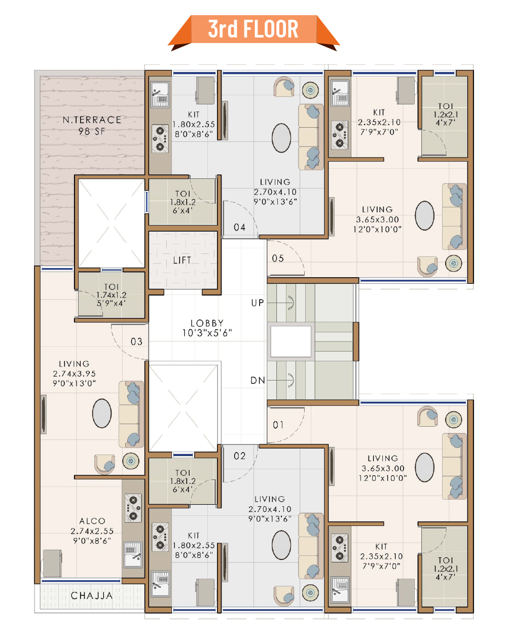 Designer glazed tiles dado upto beam anitary wares. Concealed plumbing with premium quality C. P. fitting.